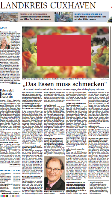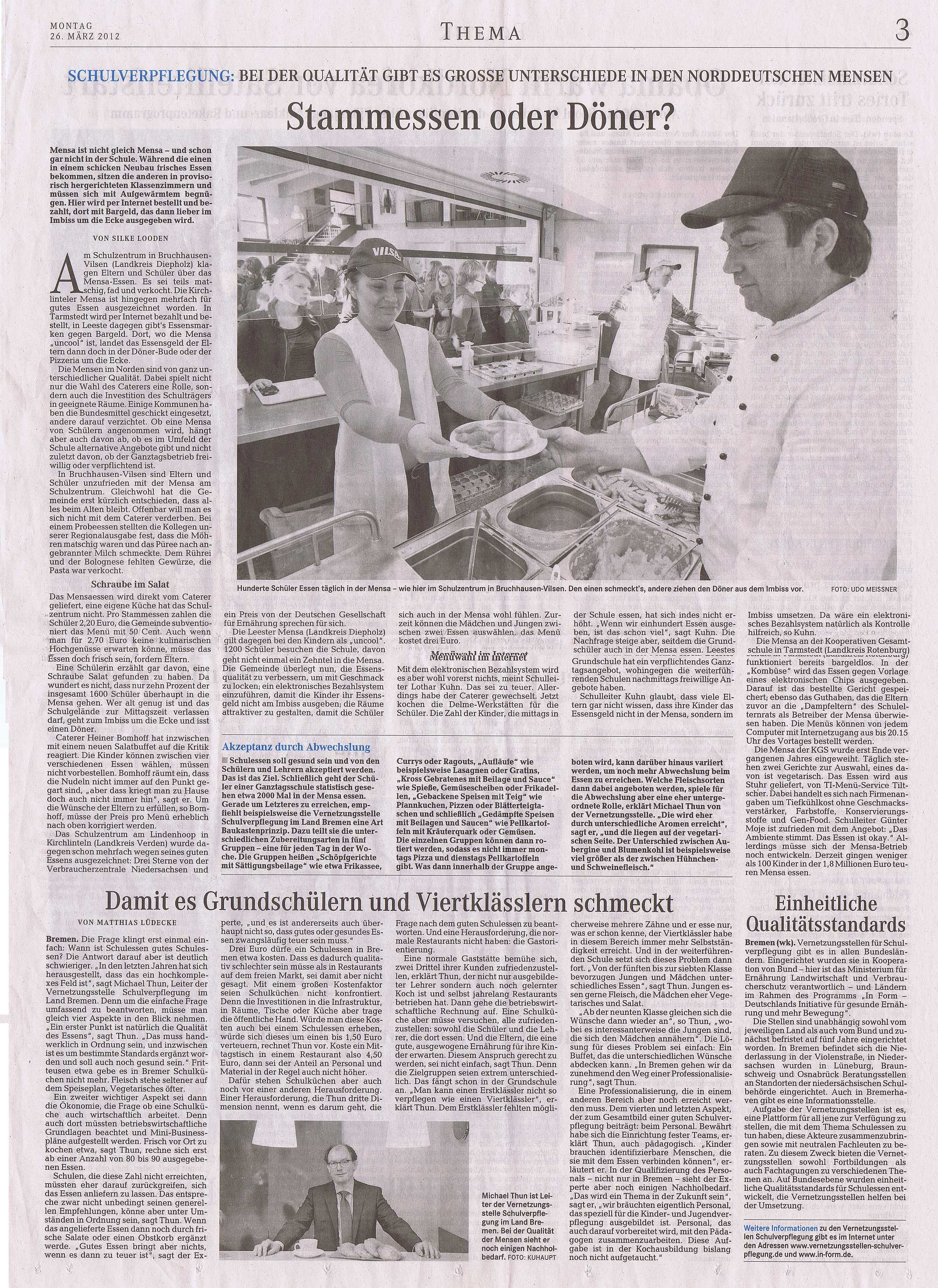 Zeitungsbericht zur Sitzung des Schulausschusses der Gemeinde Weyhe am 6. Mai 2014 im Rathaus. Die Schulverpflegung soll mit einem zeitgemäßen Konzept auf den neuesten Stand gebracht werden.